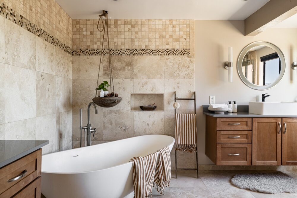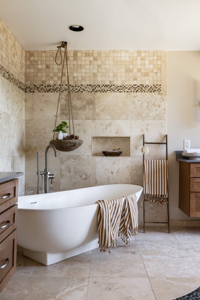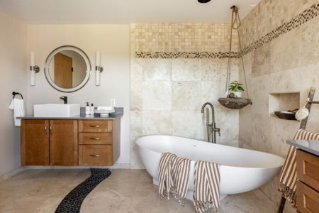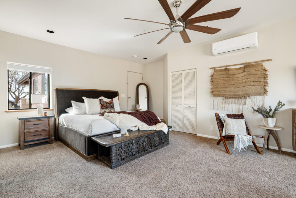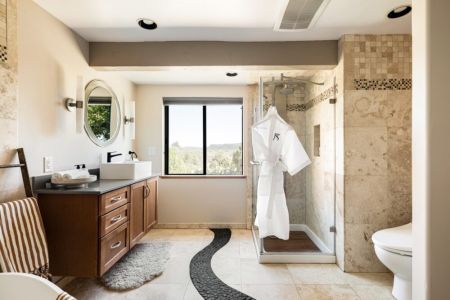 ☀The primary bedroom features a sumptuous king bed and a spa-inspired master suite complete with a freestanding soaking tub and rainfall shower—ideal for unwinding after a day exploring Sedona's natural wonders. Master suite comes TV-free by design. Studies show that mountain views, forest trails, and starry skies have 100% fewer commercials than cable.