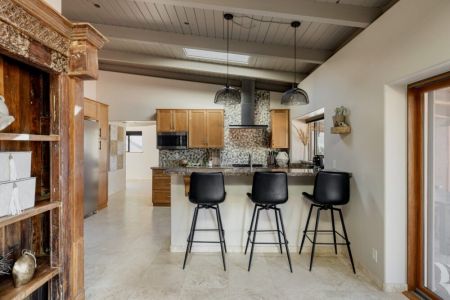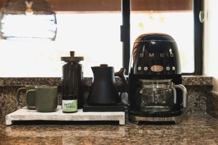 ☀︎The kitchen is a culinary enthusiast's dream, outfitted with high-end appliances and featuring distinctive SMEG coffee maker and tea kettle that add both style and function to your morning ritual. Complimentary tea and coffee are provided. Fully stocked w/ pots, pans. Views of Thunder Mountain out your kitchen windows.