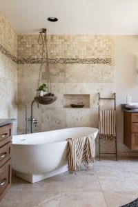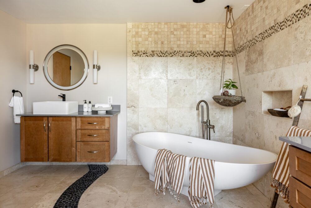 Master bathroom has two vanities, walk in shower with multiple jets, fluffy towels, eco friendly soaps and a stand alone tub. Repurposed vintage pulley transforms your bath into a spa retreat.