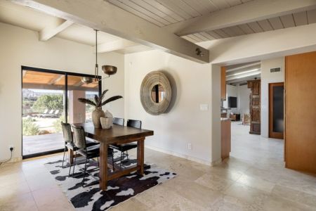 ☀︎The dedicated dining space features an expandable table to accommodate bigger gatherings, while a second fireplace creates an intimate atmosphere for memorable meals.