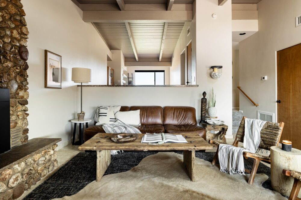 ☀︎Features luxury leather sofa with warm wood tones, Smart TV and Indoor fireplace providing cozy warmth and ambiance for cooler desert nights.