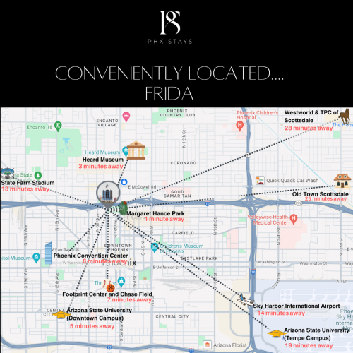 Welcome to The Frida, where classic charm meets vibrant artistry in Downtown Phoenix's Roosevelt Neighborhood—the city's first designated historic district. This enchanting Spanish studio captures the spirited essence of its namesake while offering modern comfort in one of Phoenix's most walkable and culturally rich areas. Whether you're looking to shop and dine on Roosevelt Row, catch a show at The Van Buren, or catch a fly ball at Chase Field, you're at the right place.