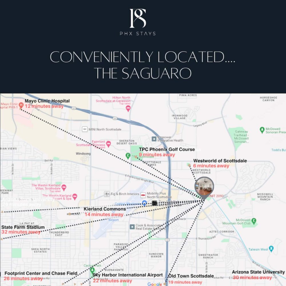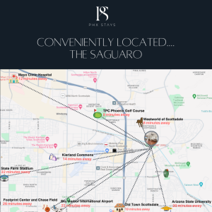 Welcome to The Saguaro. Scottsdale Vacay at it's finest. Walking distance to excellent neighborhood restaurants, markets, coffee houses, salons & parks. McDowell Mountain Sonoran Preserve is steps away for hiking and biking. Short drive to Spring Training Baseball Stadiums, 1.4 miles to WestWorld, Barrett-Jackson Auto Show, Arabian Horse Show, TPC Golf, Casinos & dozens of nearby amenities and attractions that Scottsdale has to offer.