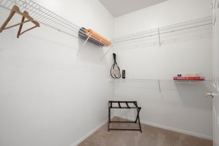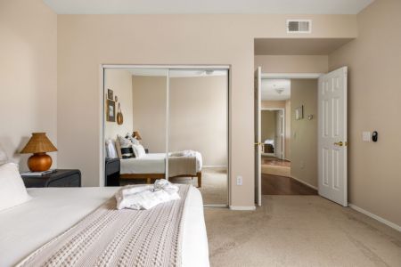 This room does not have a closet. There is a closet right outside the bedroom door.