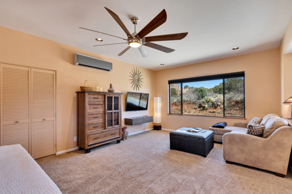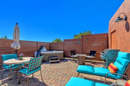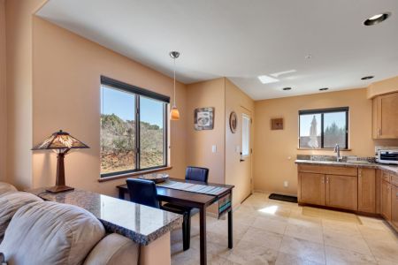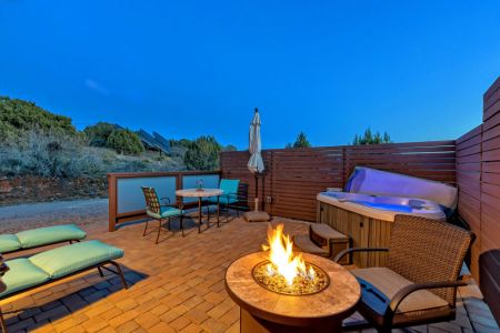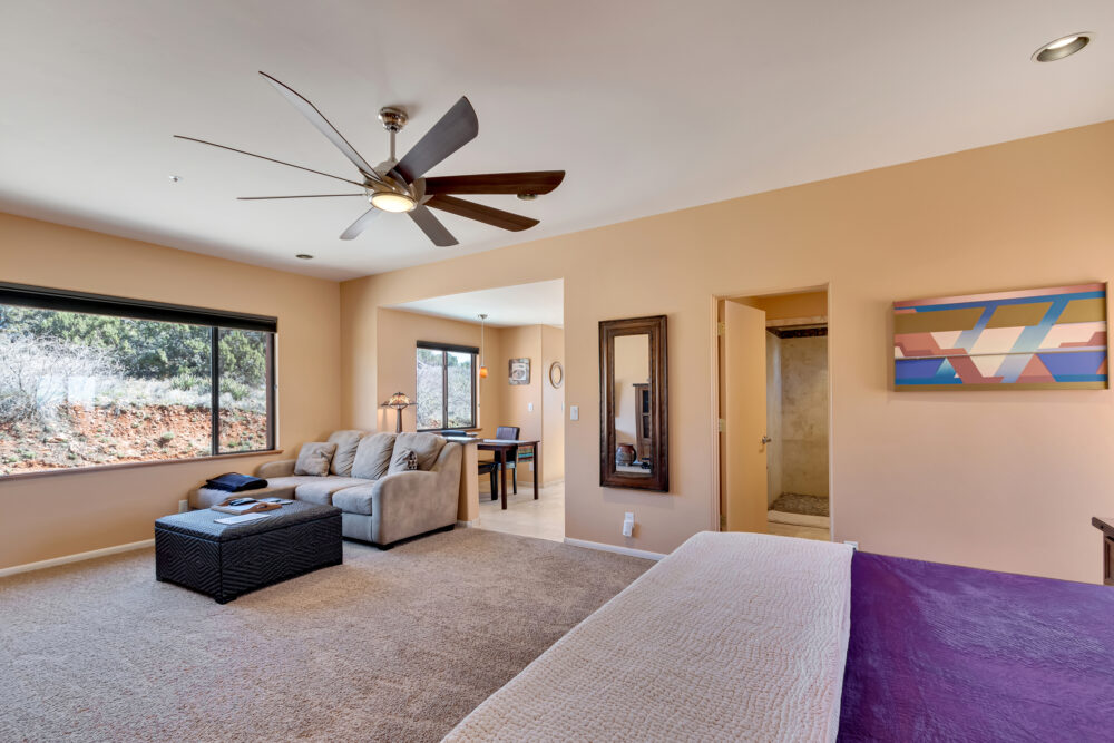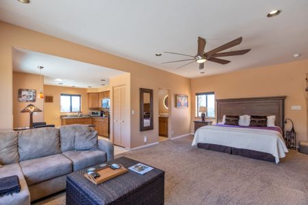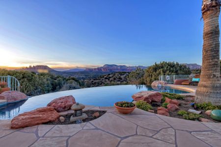 The property is on 2.5 acres with the best views in all of Sedona. The large Southwest style main house sits on the high end of the property and the Studio occupies the S/E corner of the home. The view from the Studio is of Thunder Mountain to the east and Schuerman Mountain to the south. On the west side of the home is the sun patio with the infinity pool. You can't see the pool from the Studio but you do have full daytime access to it. Down the hillside on the lower end of the property is the 1 bed, 2 bath Villa. The studio is connected to the main home but has its own private access and private patio.