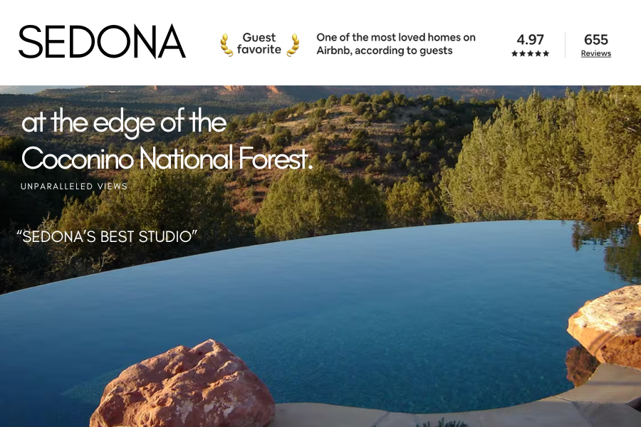 FEATURED as one of the BEST Studios in SEDONA! Walking into this private studio in Sedona feels like stepping into a secret + sacred space. This magical 2.4 acre site sides to National Forest w/ shared INFINITY POOL & 360 views. Minutes from trails, restaurants & excursions.