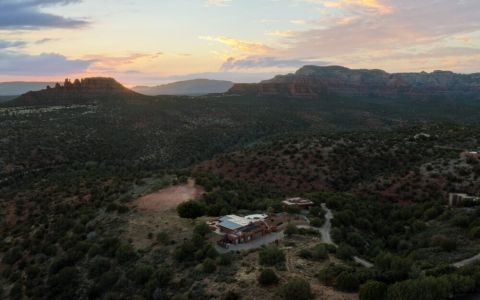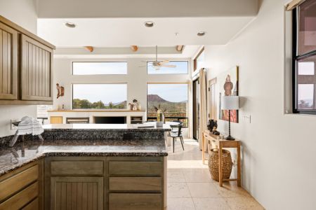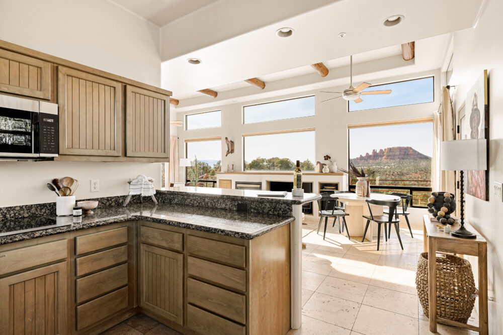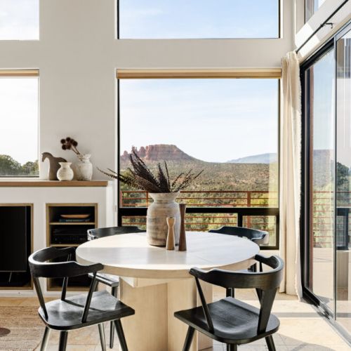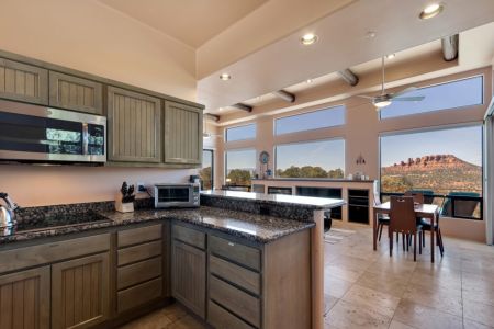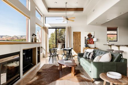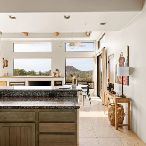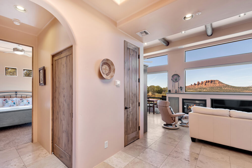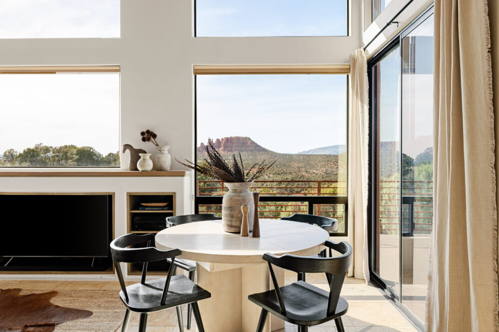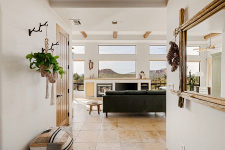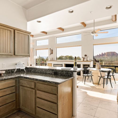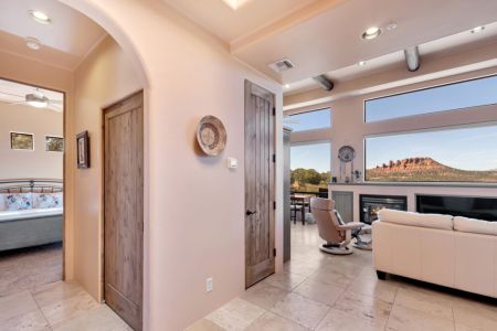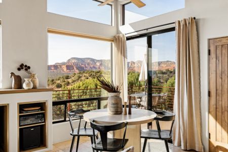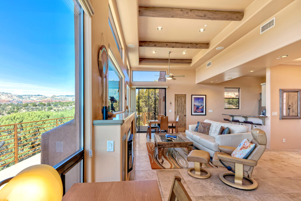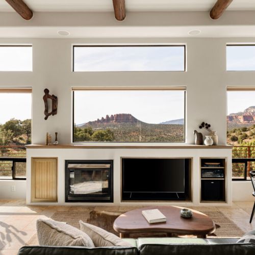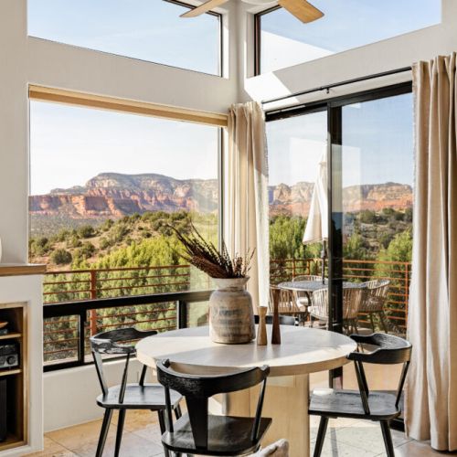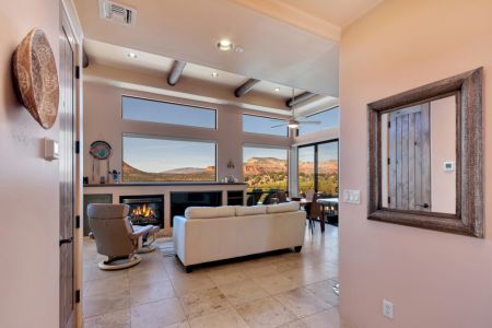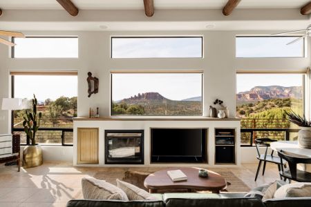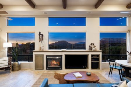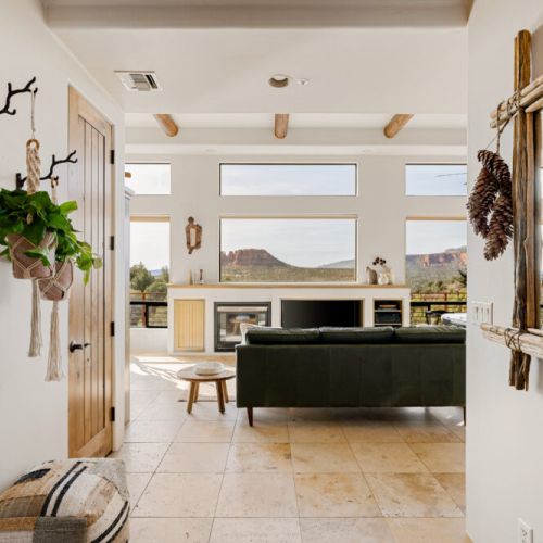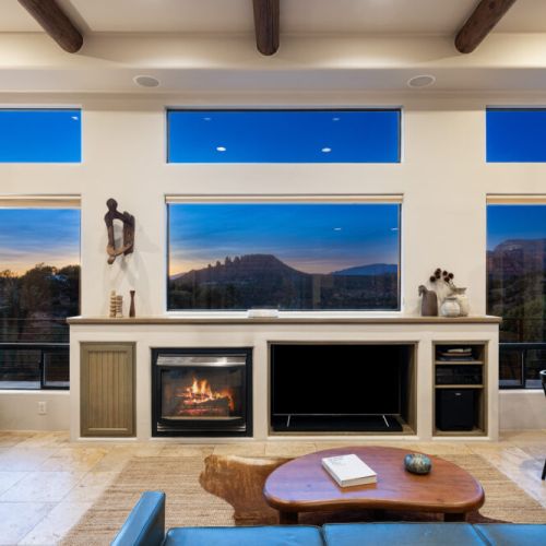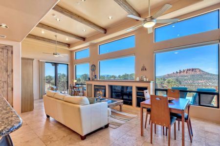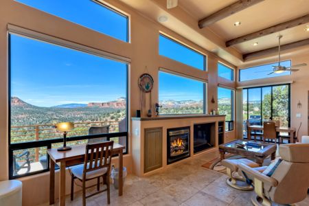Prepare to be captivated by commanding panoramic views of Sedona's legendary red rock landscape through floor-to-ceiling windows.