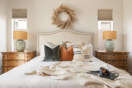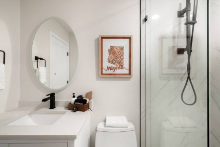 The Desert Oasis offers 3 bedrooms each with their own design personality. The spacious master suite includes a luxurious and inviting King Sized bed, a Smart TV and a show stopping Master bathroom with a soaking tub, walk in shower and large walk-in closet. The second Master suite features a luxurious King bed with a private walk in shower. The third bedroom offers a Queen Murphy Bed that also can serve as an office space with a large desk and chair.